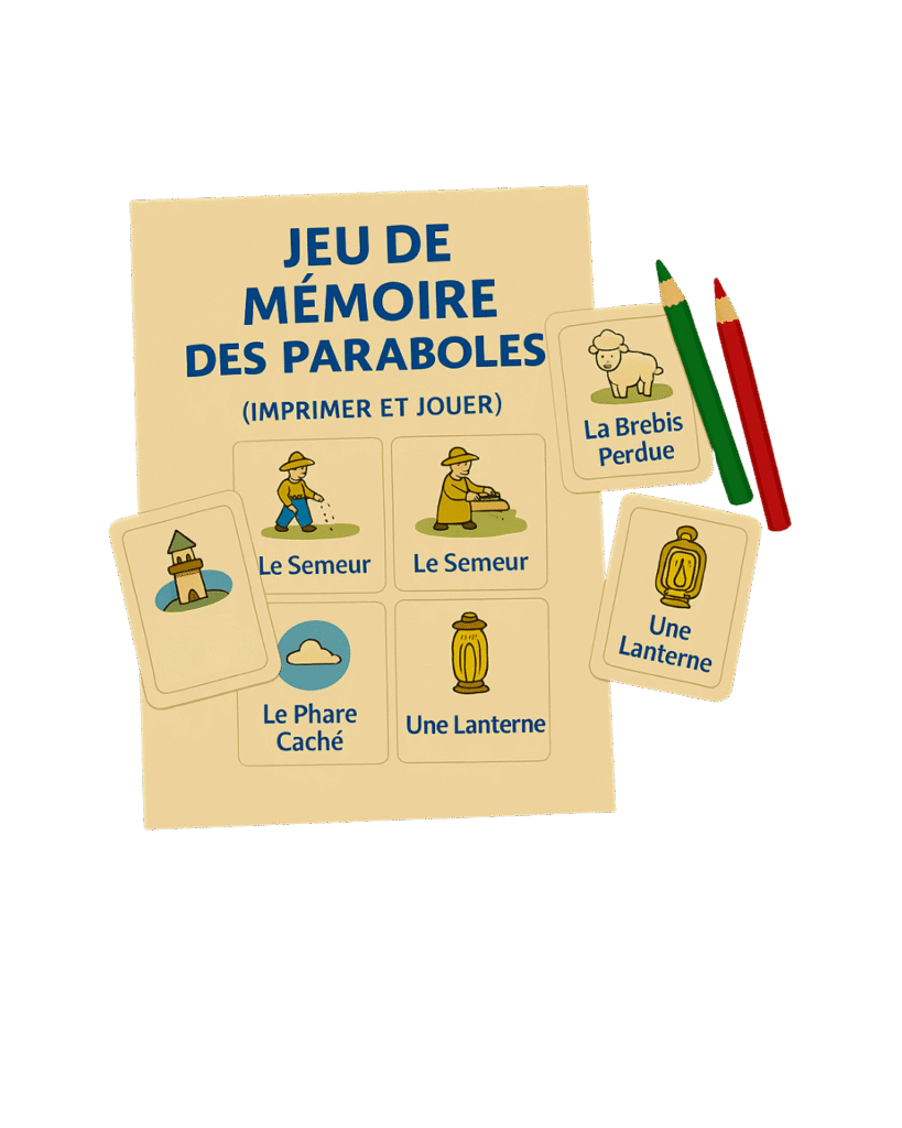 Cartes colorées avec les noms et symboles des paraboles à découper, jouer et mémoriser le contenu biblique dans la joie.